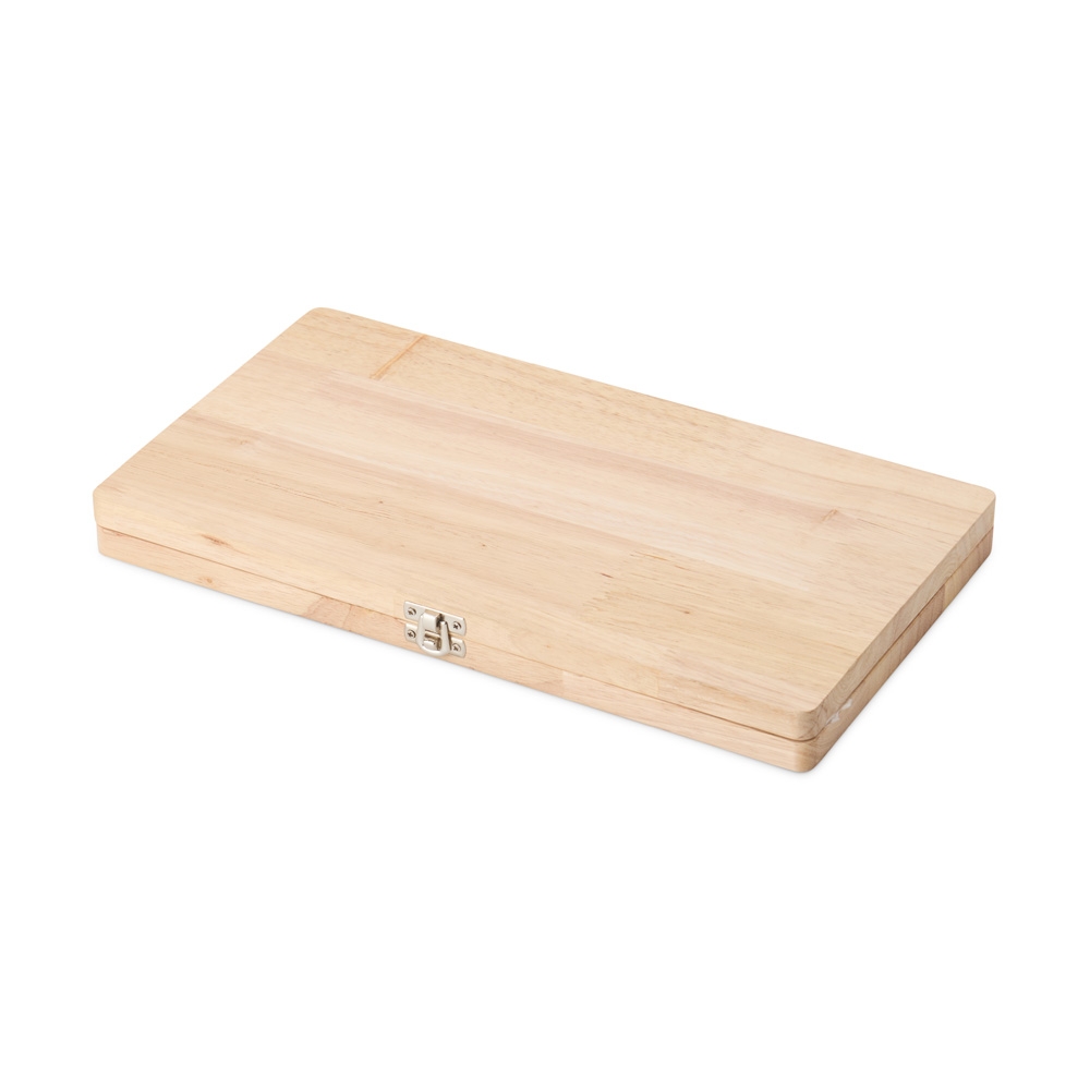 Descrição: Kit churrasco 4 peças em estojo de madeira. Contém três facas e um garfo de inox com pegadores de madeira.